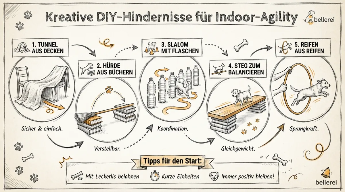 | Hürde | Besenstiel, Kissen, Bücherstapel | Die Höhe an den Hund anpassen und keine scharfen Kanten verwenden. |